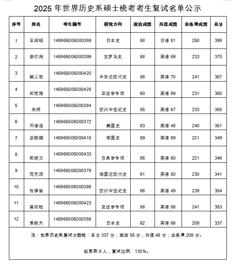 2025年世界历史系硕士统考考生复试名单公示