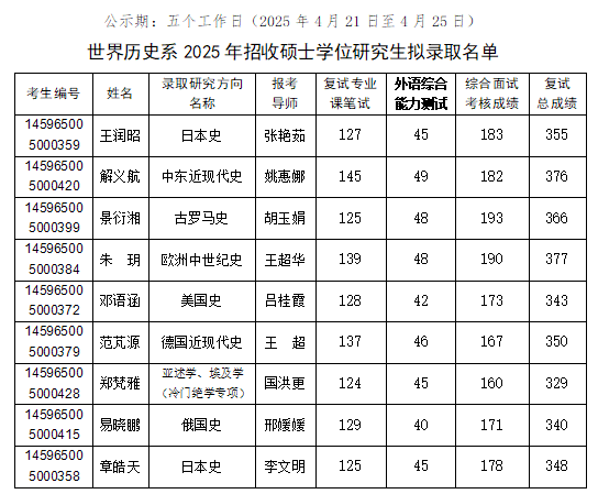 公示期内,如对结果有异议,请书面具名向世界历史系反映,申诉联系方式见本院系招生工作方案或招生目录。