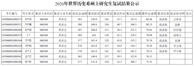 2026年3月21日,世界历史系在中国社会科学院大学良乡校区进行了硕士研究生招生复试工作。现将复试结果予以公示: