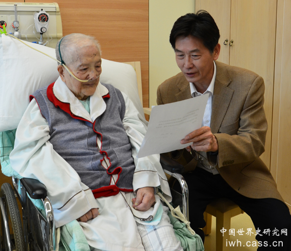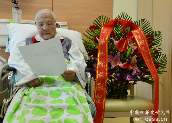 5月9日张顺洪所长代表所领导班子前往协和医院为黄老祝寿。张顺洪带去了王伟光院长敬赠的花篮和赵胜轩副院长的贺词,代表所领导送了寿金,并与黄绍湘先生合影留念。黄先生认真地看着赵胜轩副院长写的贺词,激动地说:“大家都很忙,谢谢了。”
