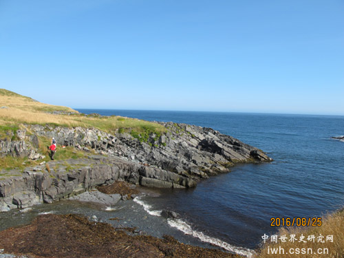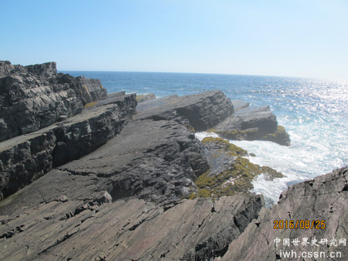 失误点的地名来自此地多发的海难事故。因为在有雾或阴雨天气,船员很容易误以为它就是附近东面的开普雷斯角(Cape Race),而将船向北转向,以便进入开普雷斯港,但这个失误往往导致船只触礁。失误点就此而得名。据说,那里有名的沉船就有五十多只。来到海边,见到被风吹雨浸浪蚀而裸露的石崖,才明白我们刚走过的草地和低矮的灌木丛只是附在岩石上一薄层植被的表皮,下面没有多少土壤。海边裸露的岩石层都朝向大西洋倾斜着,有些大石块已落在水中,成为一块块礁石。面对这一宏大的景观,我不由联想,整个纽芬兰岛就是这样在大自然的作用下,从加拿大本土大陆上断裂、分离的吧?