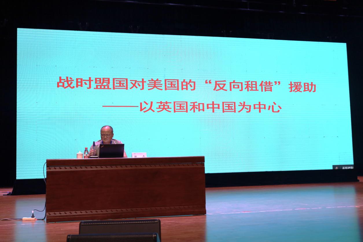 开幕式后的主旨报告环节,由研究会副会长、首都师范大学教授梁占军主持,共计4位学者发言。研究会名誉会长、武汉大学胡德坤教授在《开罗宣言是战后我国领土海洋维权的国际法保障》的报告中,从国际法的角度阐述了开罗宣言对我国海洋维权的重要性,强调其在战后对我国领土海洋维权的国际法保障地位。研究会前会长、首都师范大学徐蓝教授所作《百年变局下的战争与和平问题研究》报告,从五个世纪以来国际体系、格局、秩序演变的角度,考察战争与和平之间的关系,阐述了中国提出的人类命运共同体解决方案对于推动世界和平发展的指导性意义。天津师范大学耿志教授在《战时盟国对美国的“反向租借”援助——以英国和中国为中心》的报告中,从二战期间盟国互相援助的角度,考察英国、中国等国对美国的反向租借,指出美国一系列互助谈判和战后清算谈判反映了美国谋求长远利益的意图。曲阜师范大学赵文亮教授的《<中国二战史研究七十年>简介》报告,从宗旨、目的、指导原则和具体内容等方面,具体介绍和阐述了自己这部著作的特色和创新。