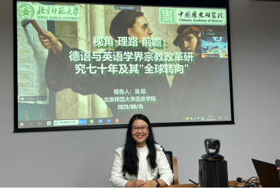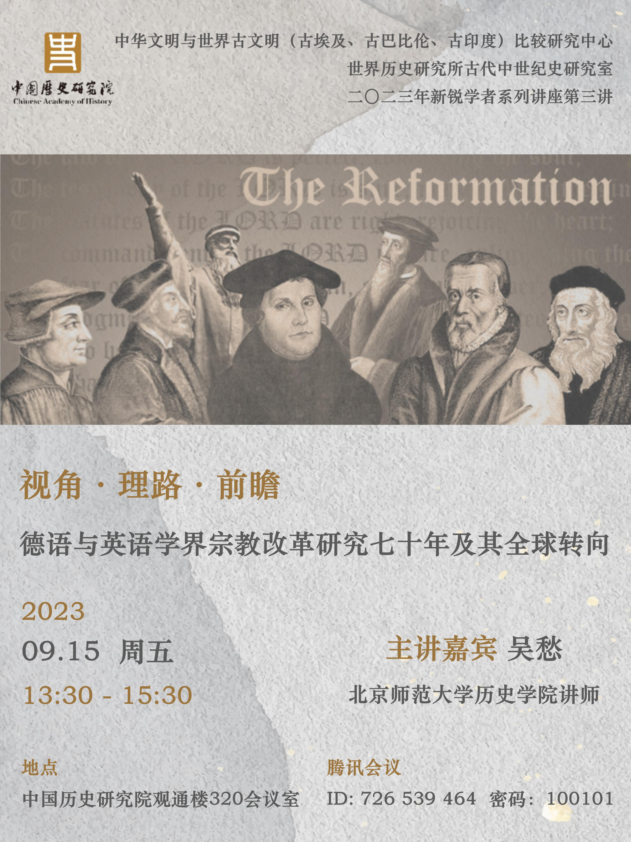 2023年9月15日下午,应中国历史研究院中华文明与世界古文明(古埃及、古巴比伦、古印度)比较研究中心,世界历史研究所的邀请,北京师范大学历史学院讲师吴愁在中国历史研究院观通楼320会议室做了题为《视角·理路·前瞻:德语与英语学界宗教改革研究七十年及其全球转向》的学术报告。此次报告是2023年古代中世纪史研究室新锐学者系列讲座的第三讲,由世界历史研究所王超华副研究员主持,采取线上线下相结合的方式。