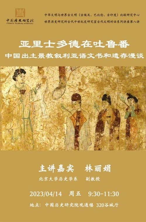 2023年4月14日上午,应中华文明与世界古文明(古埃及、古巴比伦、古印度)比较研究中心、世界历史研究所古代中世纪史研究室邀请,北京大学世界历史学系林丽娟副教授做了题为《亚里士多德在吐鲁番——中国出土景教叙利亚语文书和遗存漫谈》的学术报告。