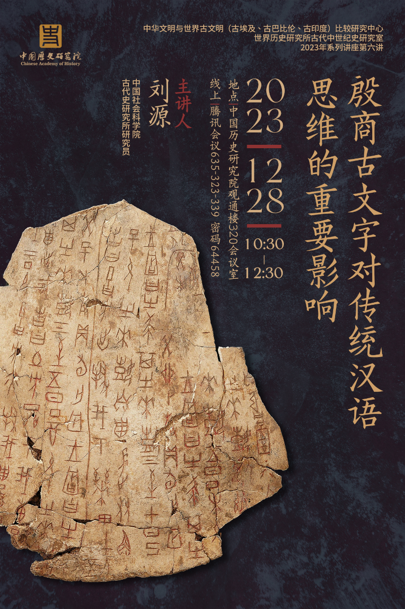 2023年12月28日上午,中国社会科学院古代史研究所刘源研究员应邀来到世界历史研究所,作了题为“殷商古文字对传统汉语思维的重要影响”的讲座。本次讲座由中国历史研究院中华文明与世界古文明(古埃及、古巴比伦、古印度)比较研究中心与世界历史研究所古代中世纪史研究室联合主办,是2023年系列讲座第六讲。讲座线下线上同时进行,来自全国科研机构和高校的学者和学生参加了本次讲座。